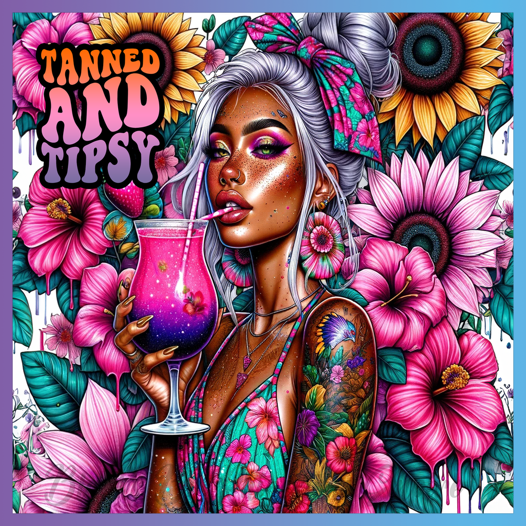 Theme: Girl with cocktail, flowers, colorful, tanned.