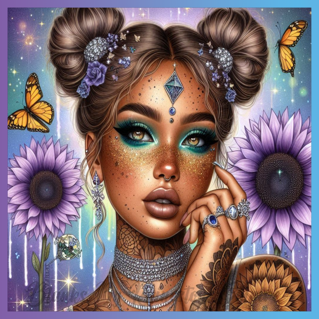 Theme: Girl with tattoo, butterflies, sunflowers, jewelry.