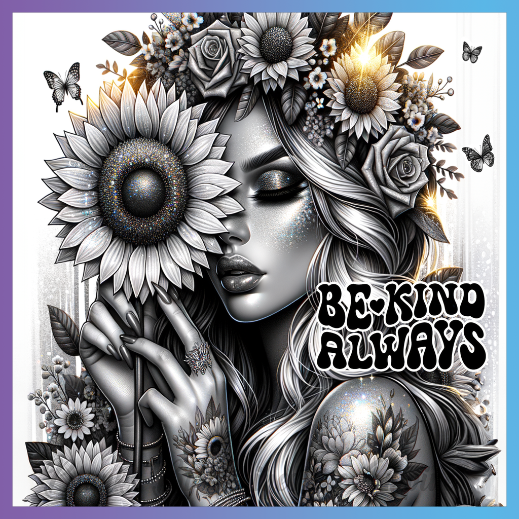 Theme: Girl with sunflower, flowers, butterflies, tattoo.