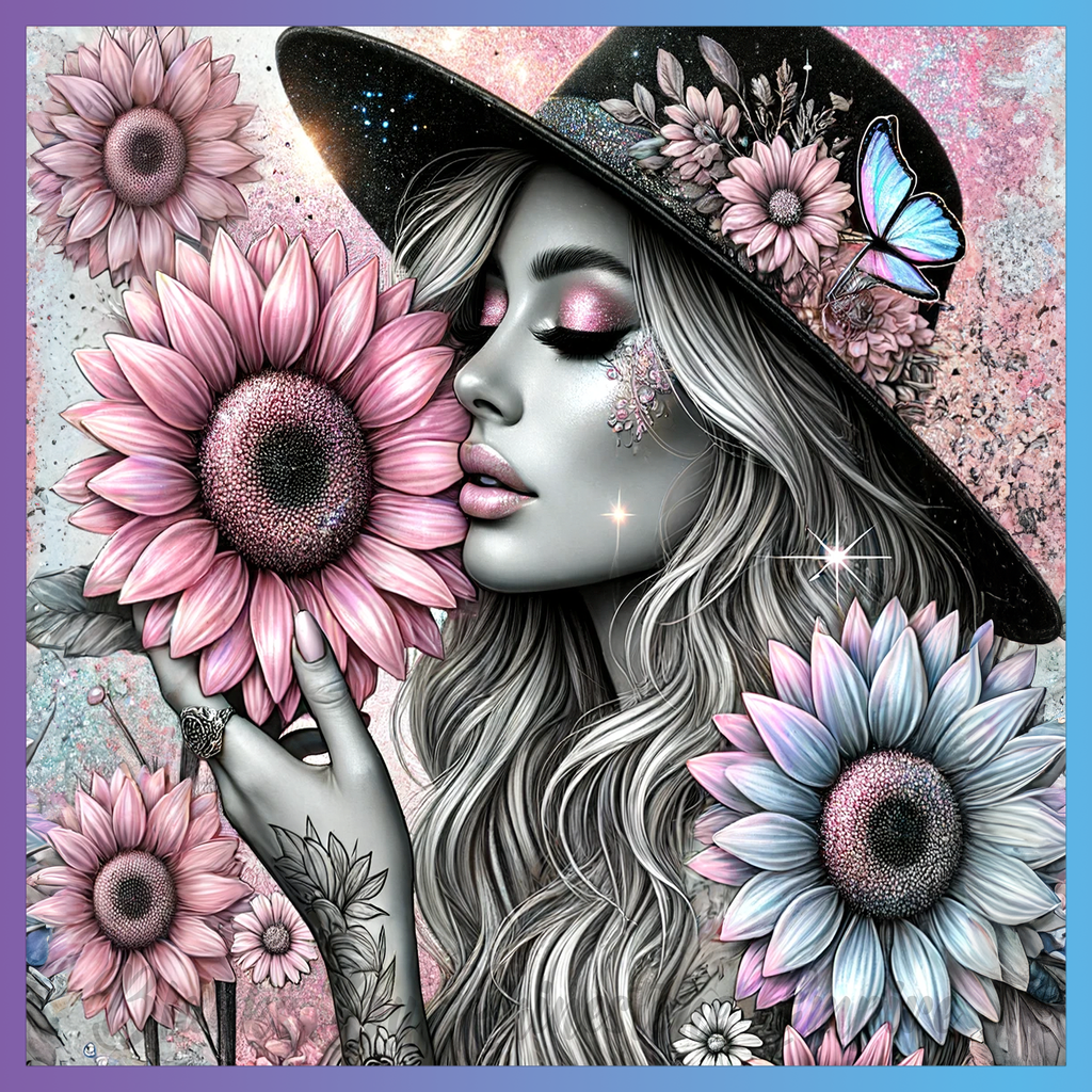 Theme: Girl with flowers, hat, butterfly, portrait.