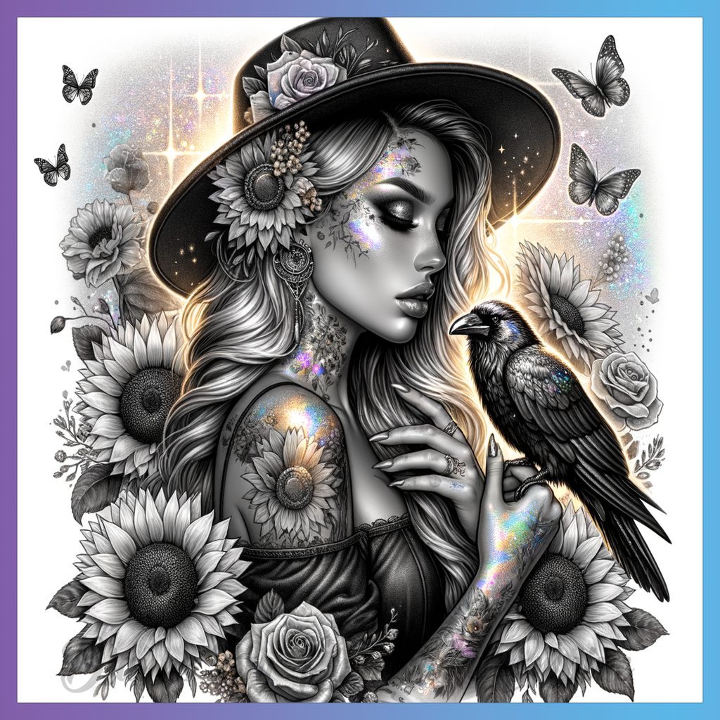 Theme: Girl with tattoo, hat, flowers, crow.