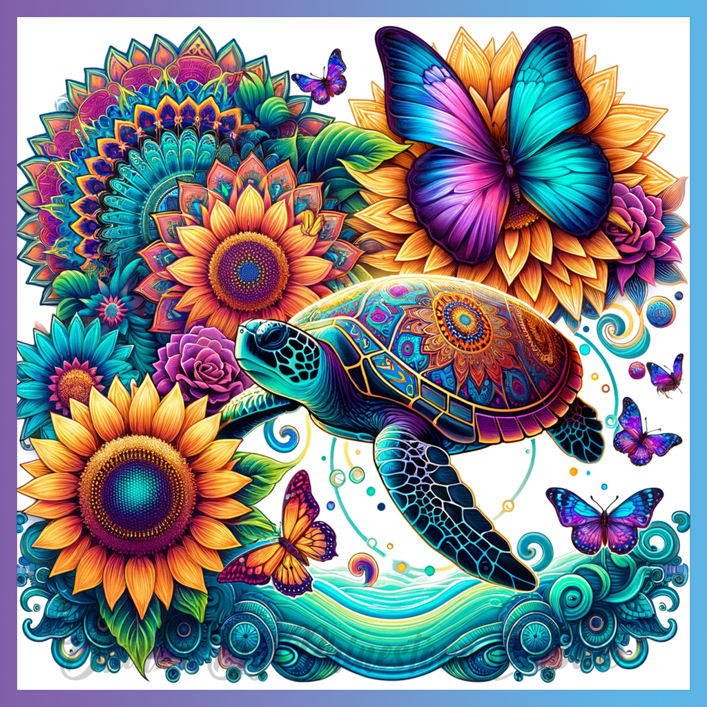 Theme: Turtle with colorful, flowers, butterflies, mandala.