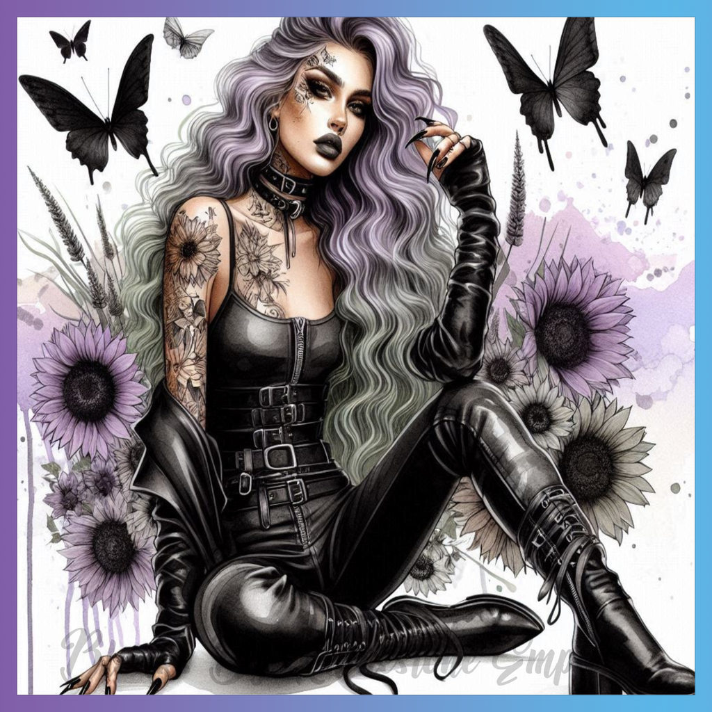 Theme: Girl with tattoo, butterflies, flowers, purple.