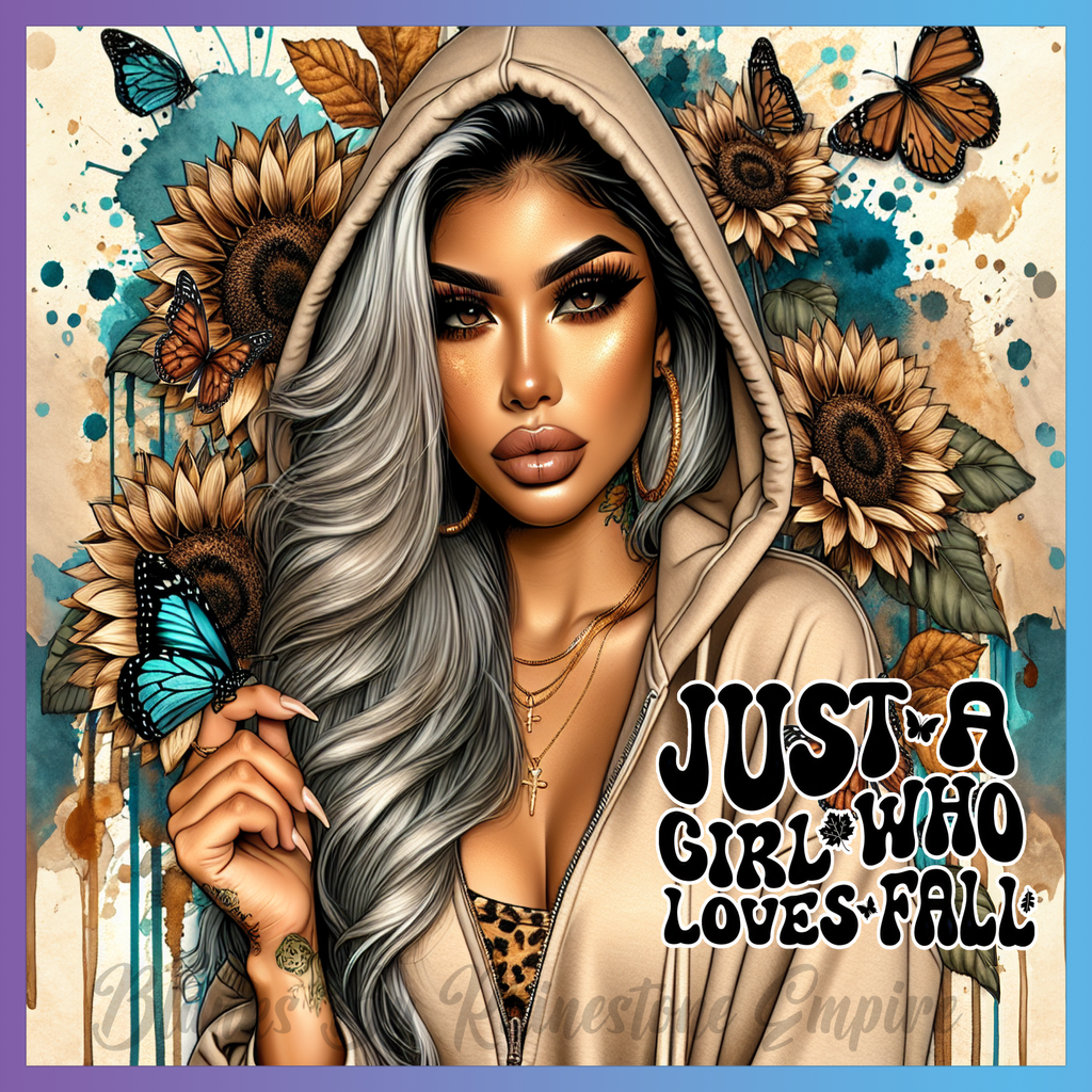 Theme: Girl with sunflowers, butterflies, fall, hoodie.