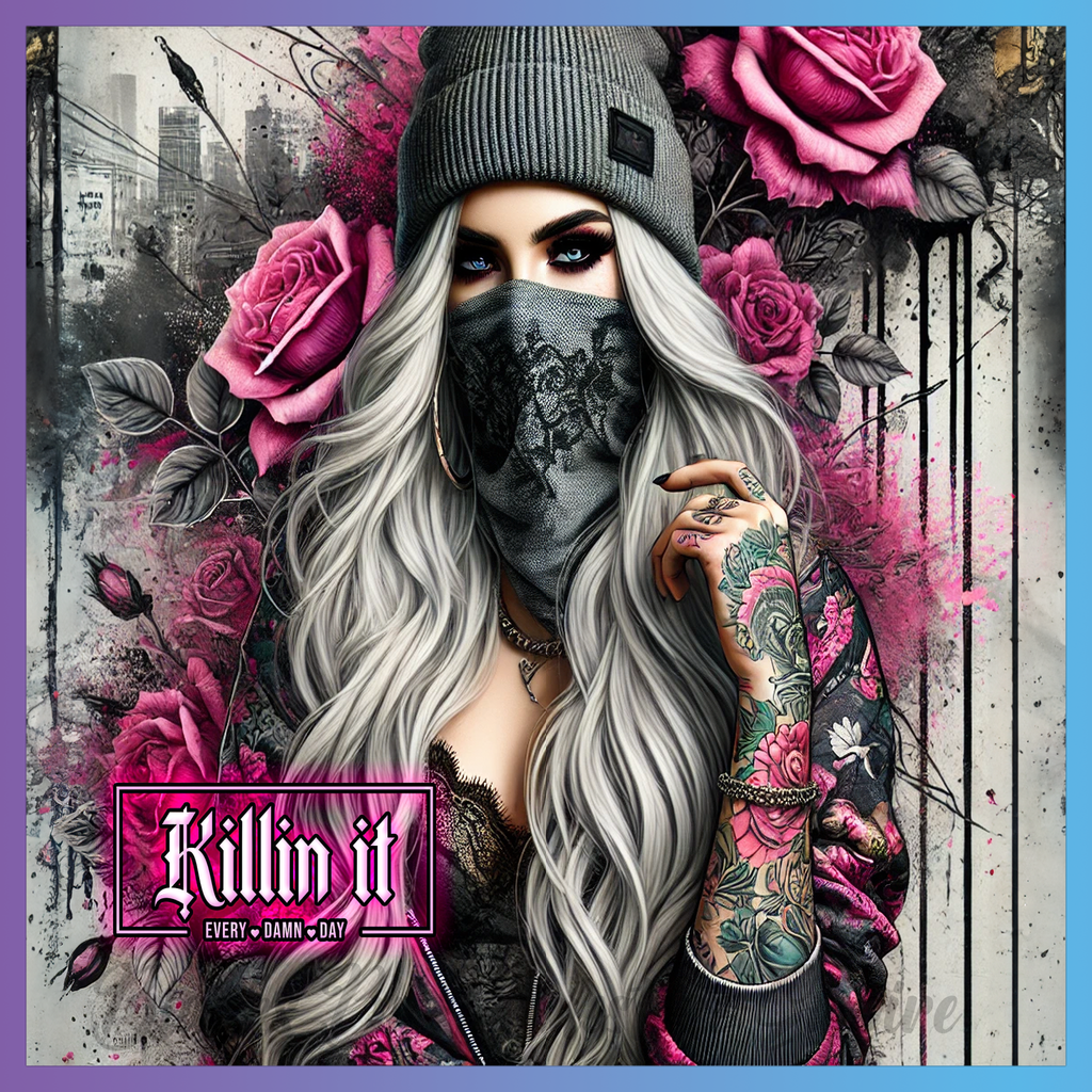 Theme: Girl with tattoo, roses, bandana, gray hair.