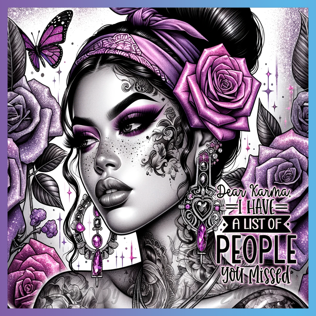 Theme: Girl with tattoo, flowers, butterfly, jewelry.