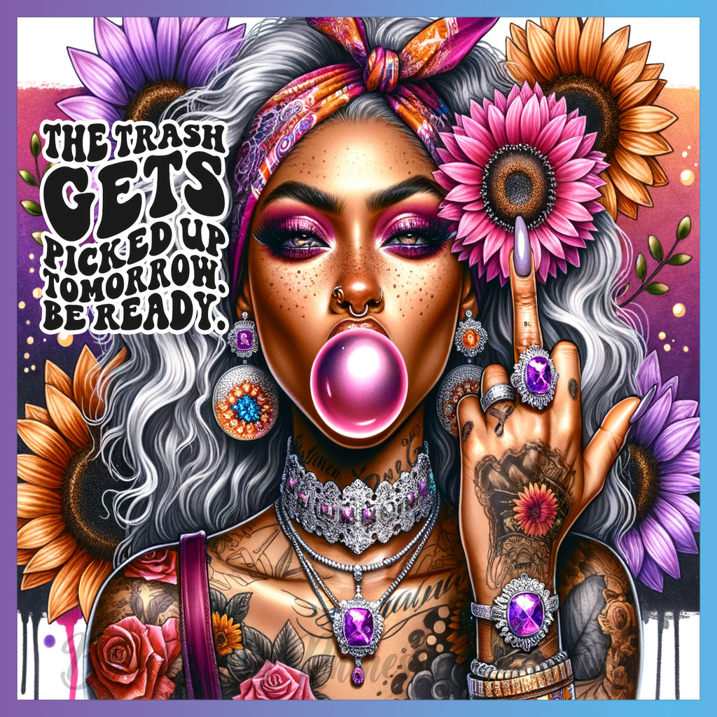 Theme: Girl with tattoo, flowers, bubblegum, jewelry.