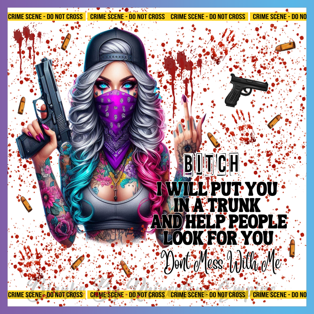Theme: Girl with tattoo, gun, blood, crime scene.