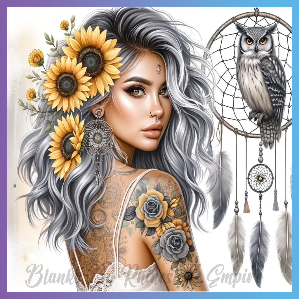 Theme: Girl with tattoo, sunflowers, owl, dreamcatcher.
