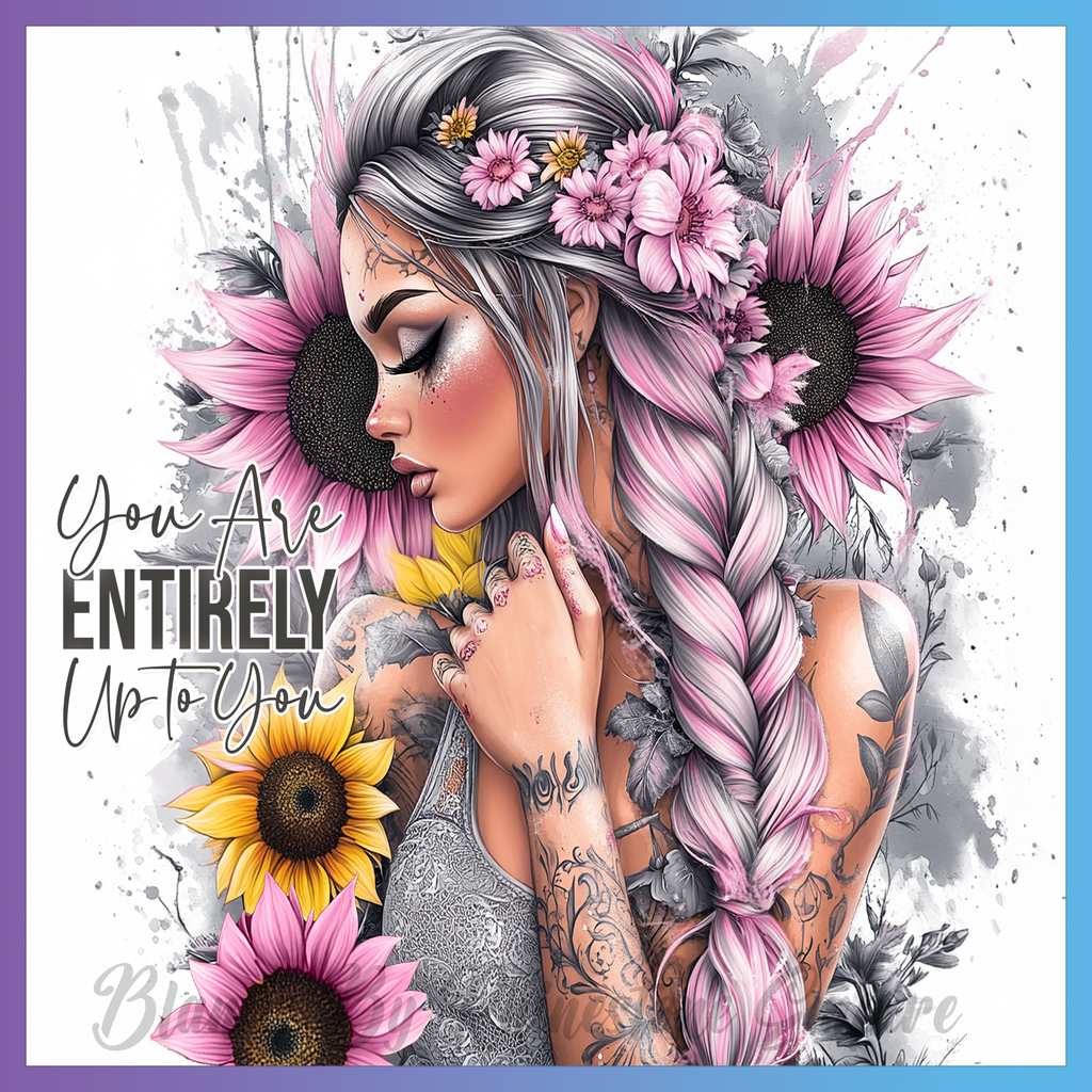 Theme: Girl with tattoo, flowers, sunflowers, braid.