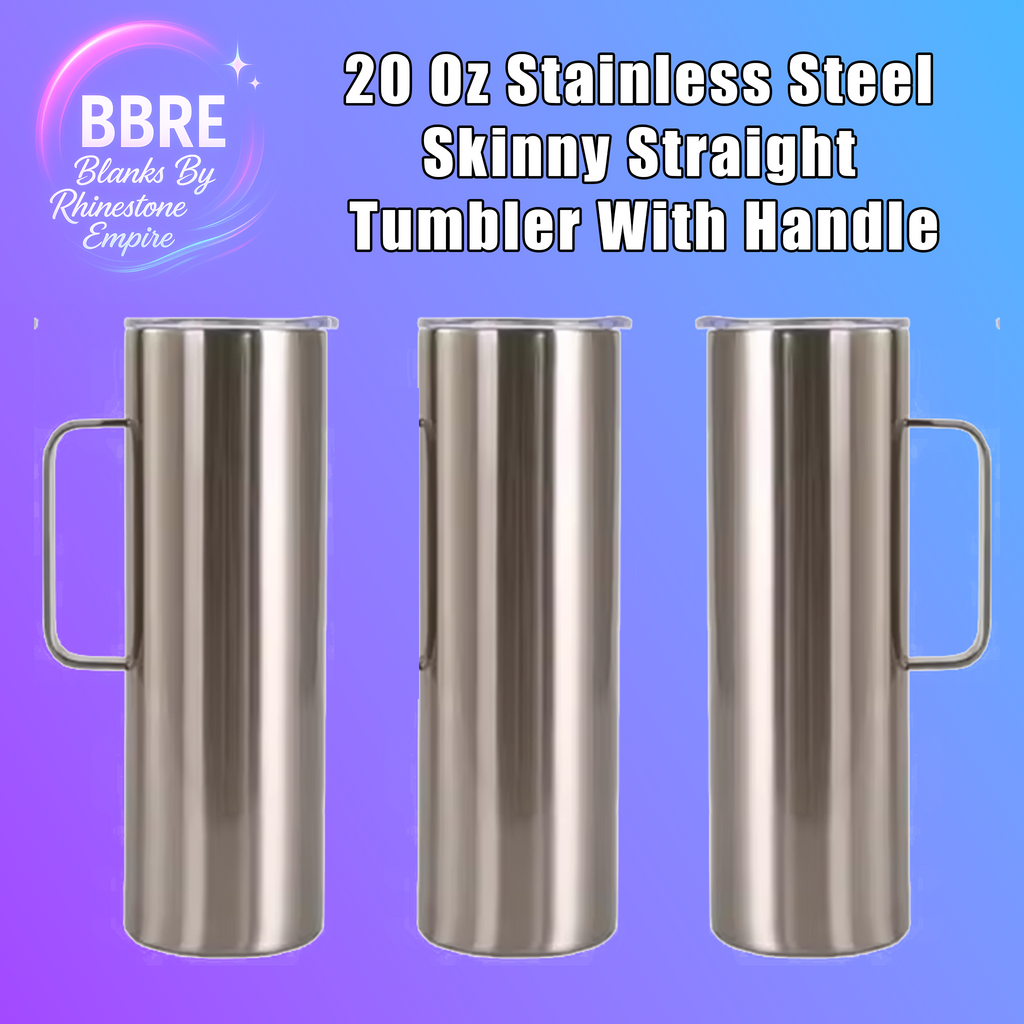 Enjoy your drinks on the go with our 20 oz Stainless Steel Skinny Tumbler with Handle. Built with durable double-walled insulation, this tumbler keeps drinks cold for hours or hot for your morning coffee. The slim profile and ergonomic handle make it easy to hold, perfect for travel, commuting, or everyday use.