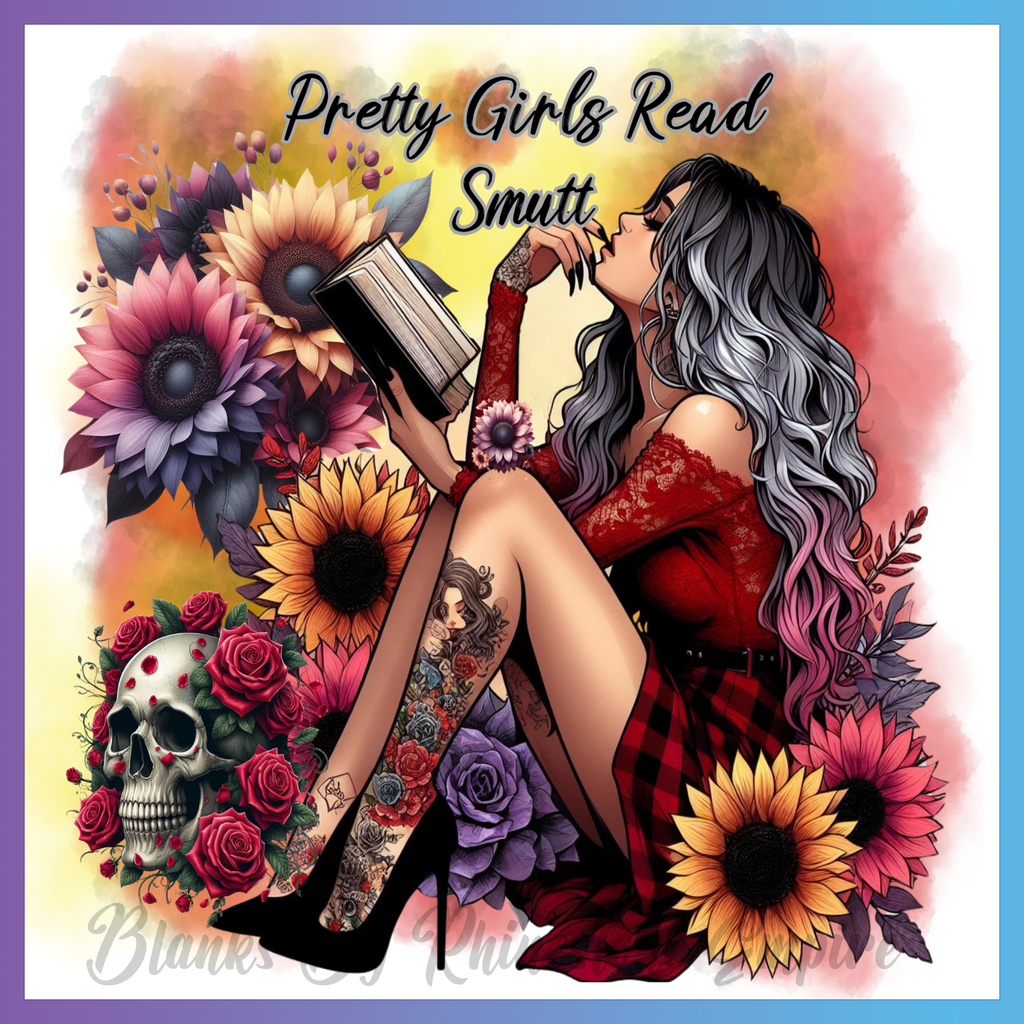 Theme: Girl with tattoo, reading, flowers, skull.