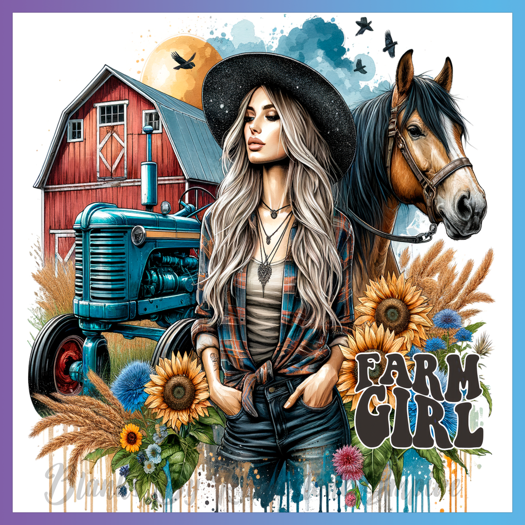 Theme: Girl with farm, horse, tractor, sunflowers.