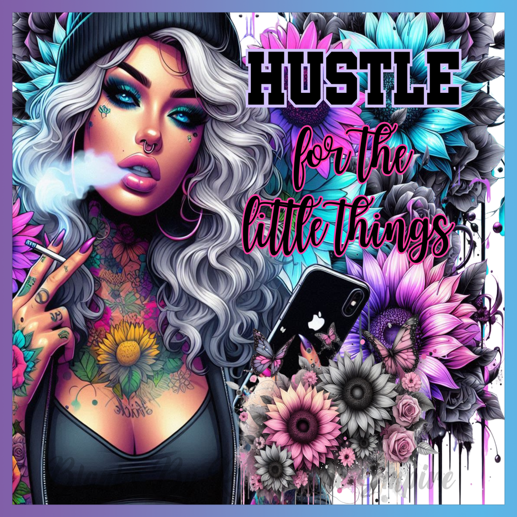 Theme: Girl with tattoo, flowers, smoke, phone.