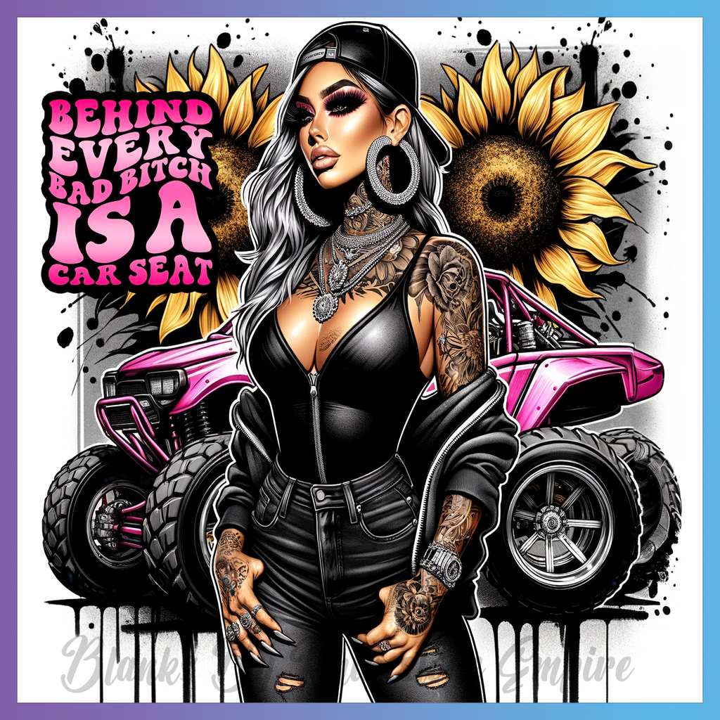 Theme: Girl with tattoo, sunflowers, car, pink.