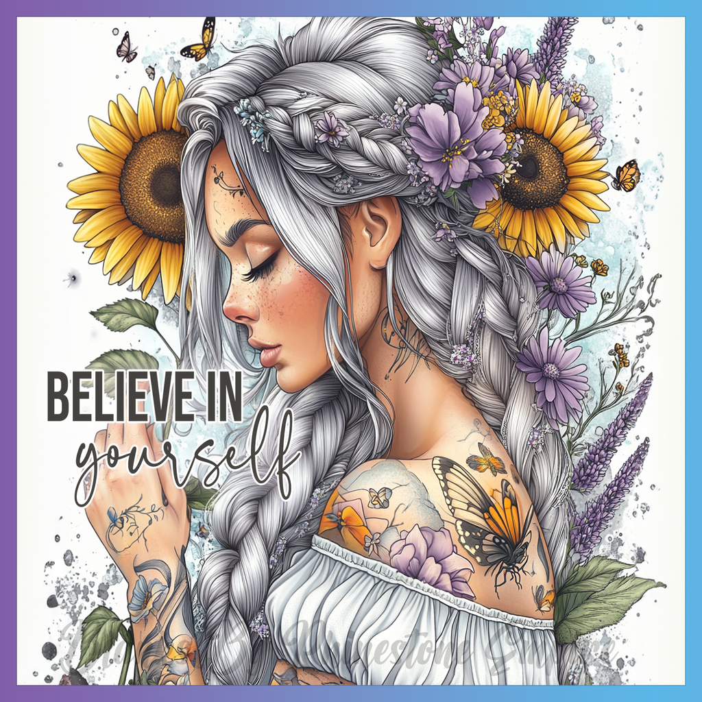 Theme: Girl with tattoo, flowers, sunflowers, butterflies.