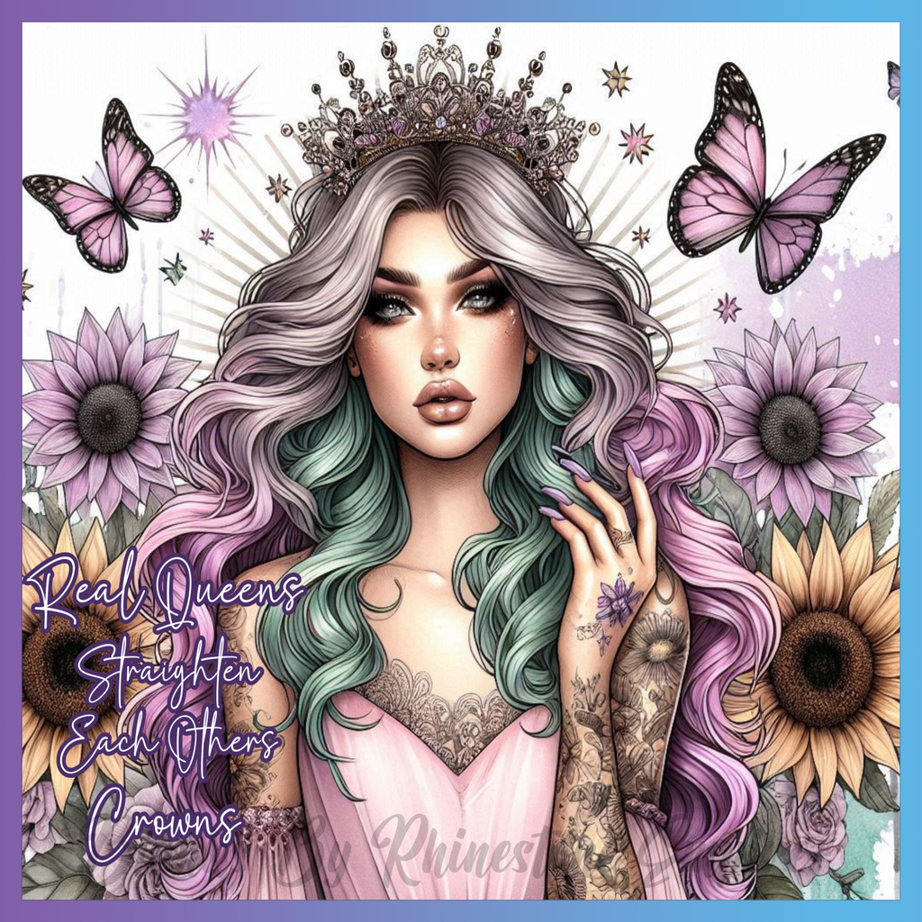 Theme: Girl with tattoo, crown, butterflies, flowers.