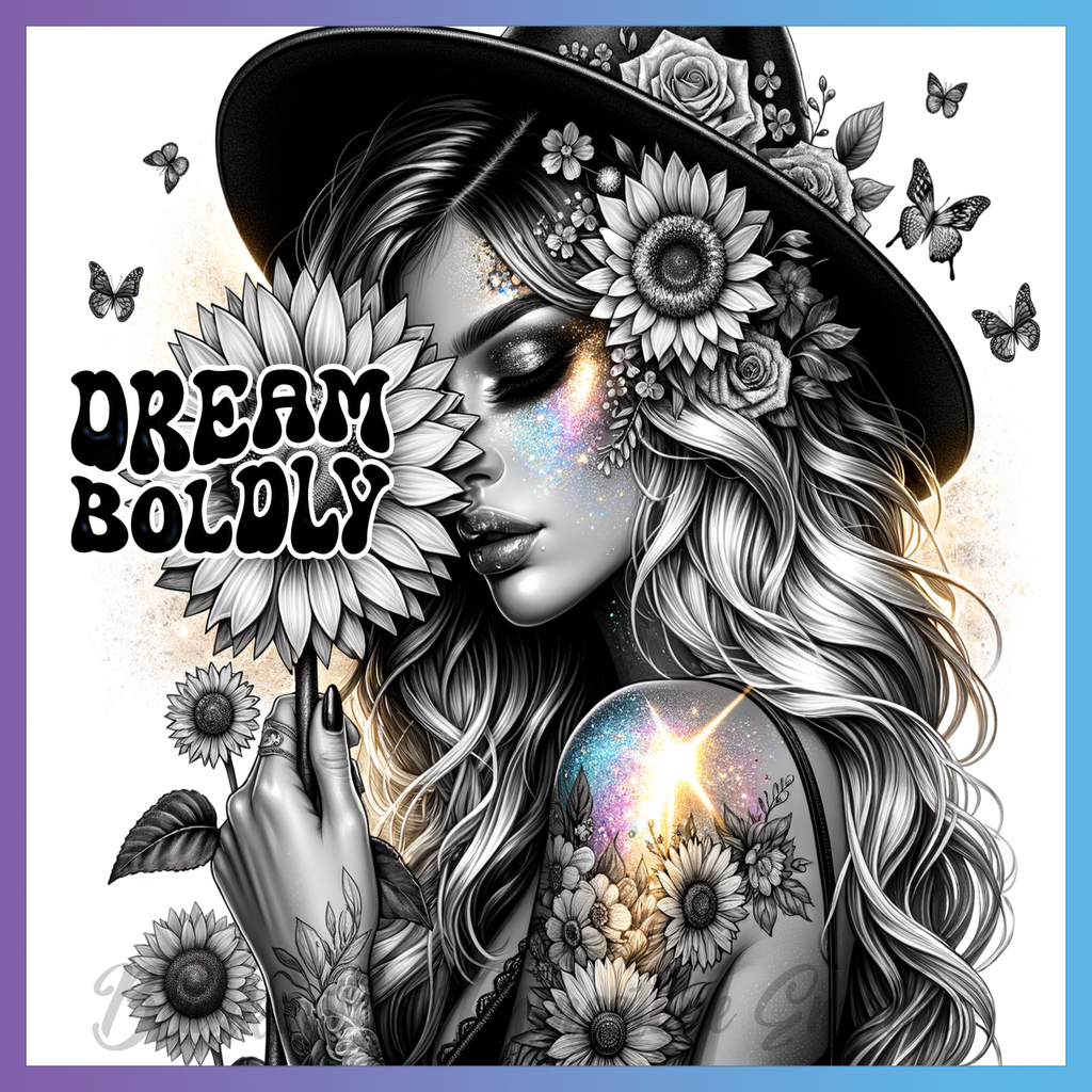 Theme: Girl with tattoo, flowers, hat, butterflies.