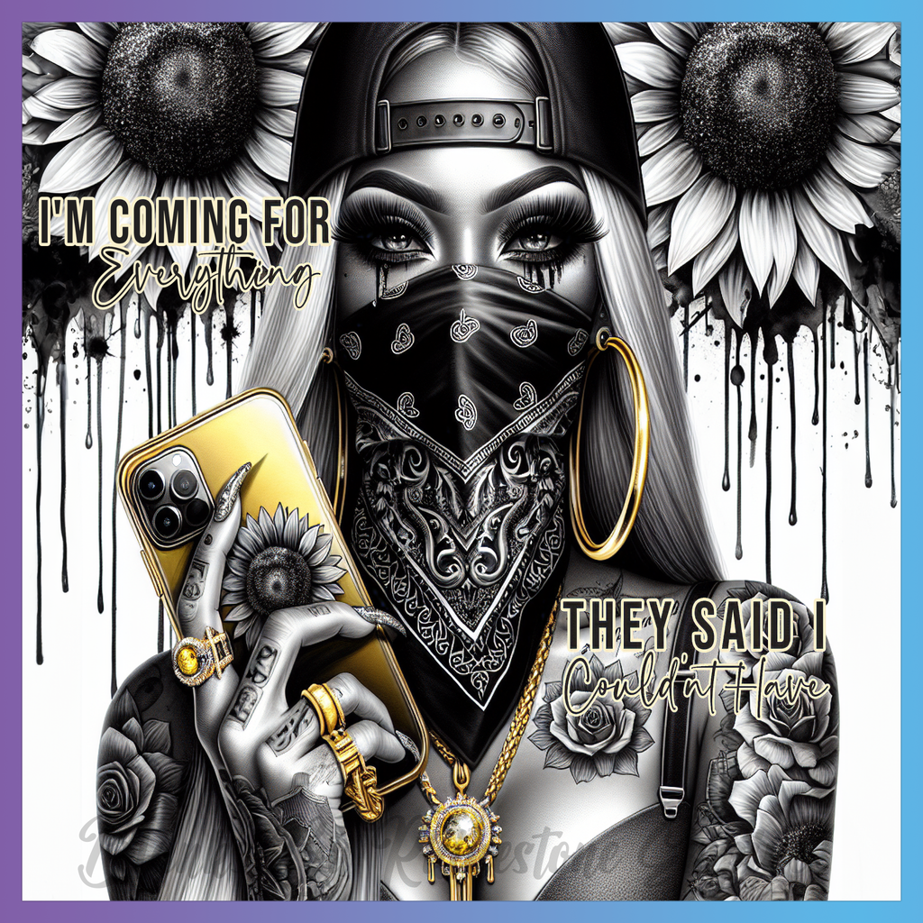 Theme: Girl with tattoo, sunflowers, mask, phone.