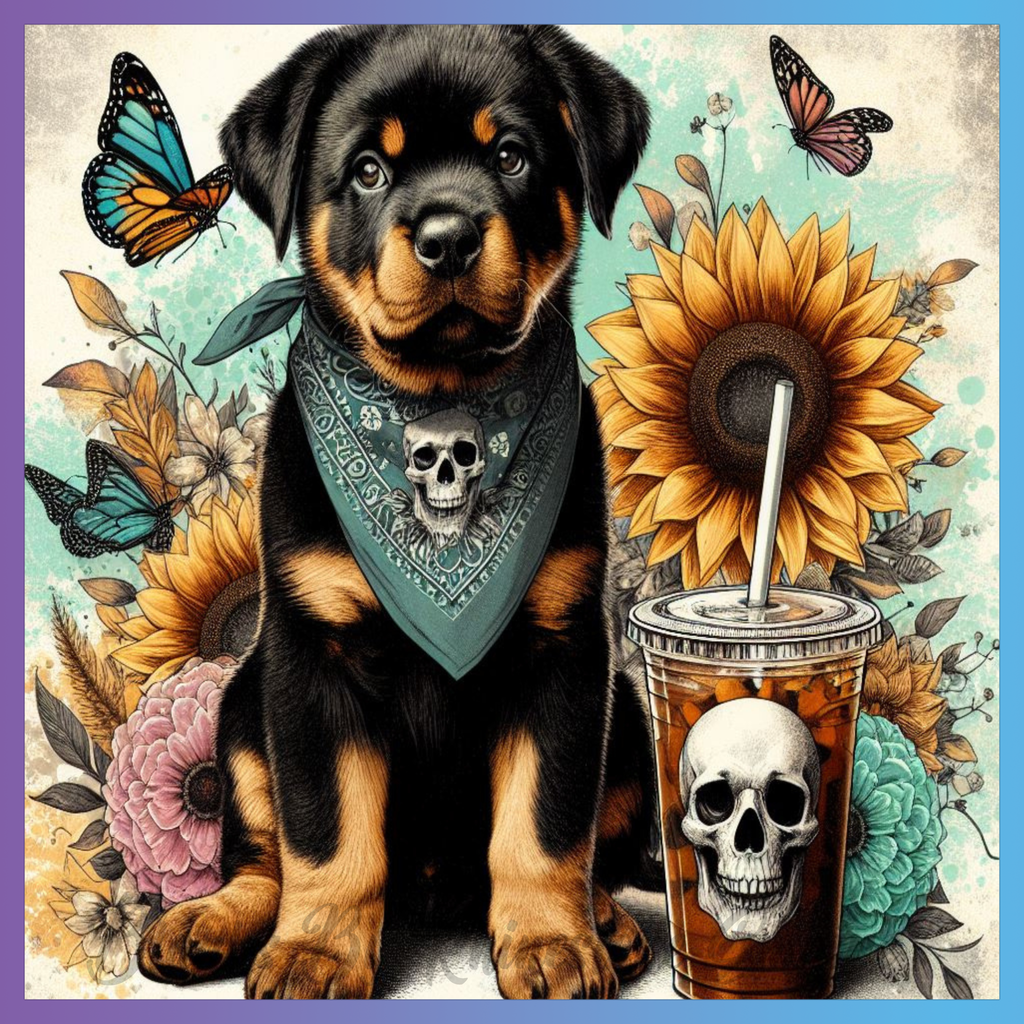 Theme: Puppy with skull, bandana, sunflowers, butterflies.