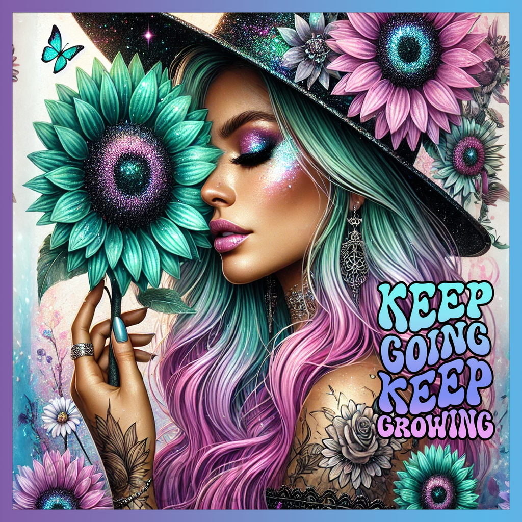 Theme: Girl with tattoo, flowers, hat, makeup.