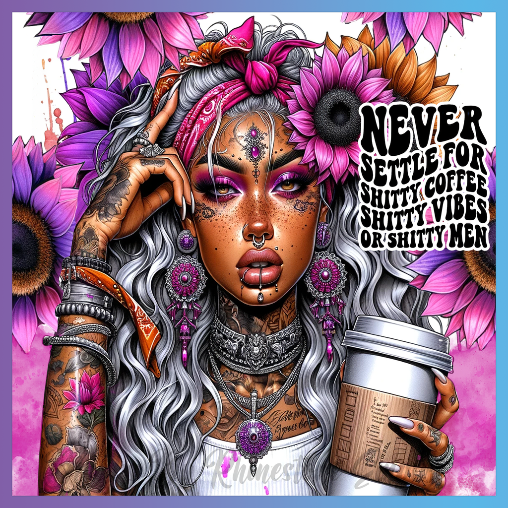 Theme: Girl with tattoo, flowers, coffee, colorful.