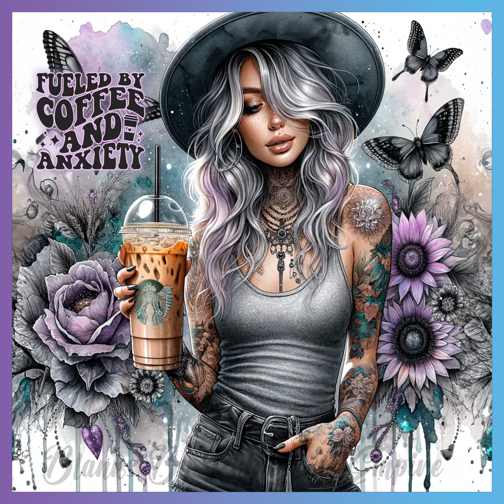 Theme: Girl with tattoo, coffee, flowers, butterflies.