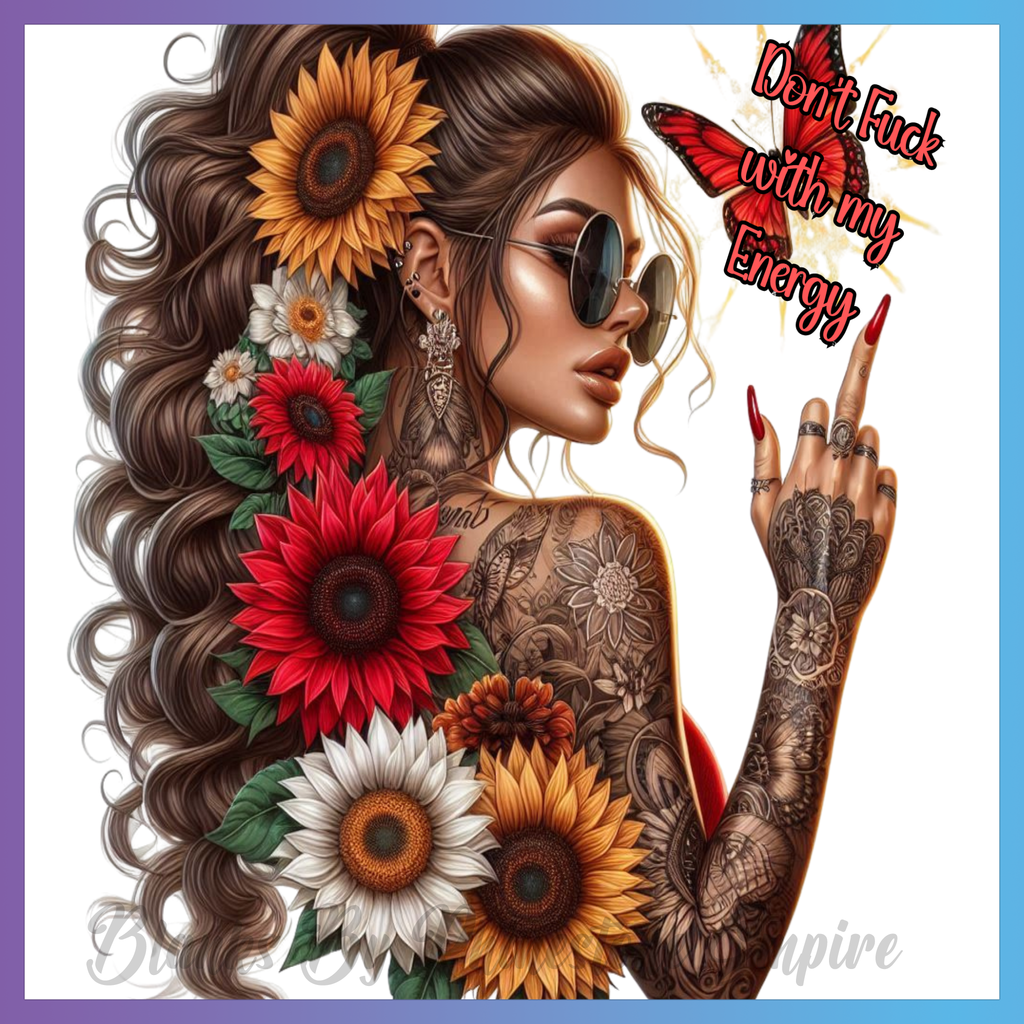 Theme: Girl with tattoo, flowers, butterfly, sunglasses.