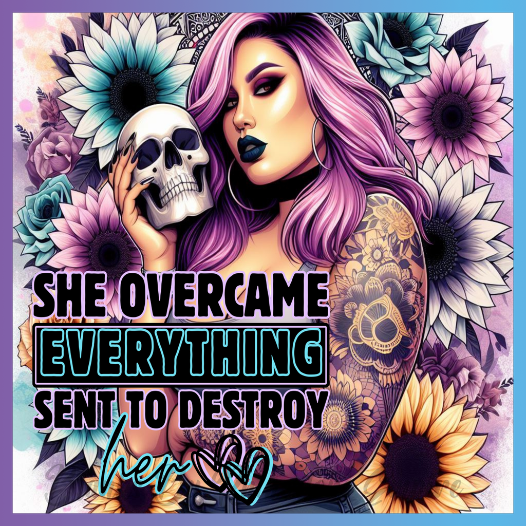 Theme: Girl with tattoo, skull, flowers, purple hair.