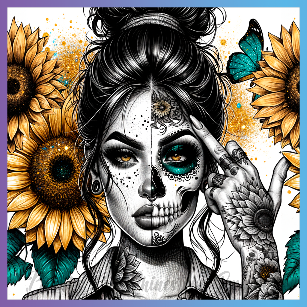 Theme: Girl with skull, sunflowers, butterflies, tattoo.