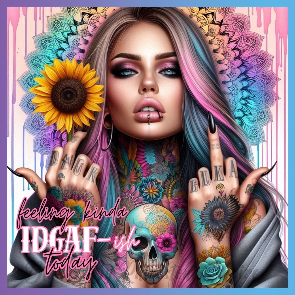 Theme: Girl with tattoo, sunflower, skull, colorful.