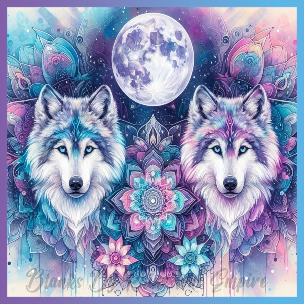 Theme: Wolf with moon, mandala, colorful, symmetrical.
