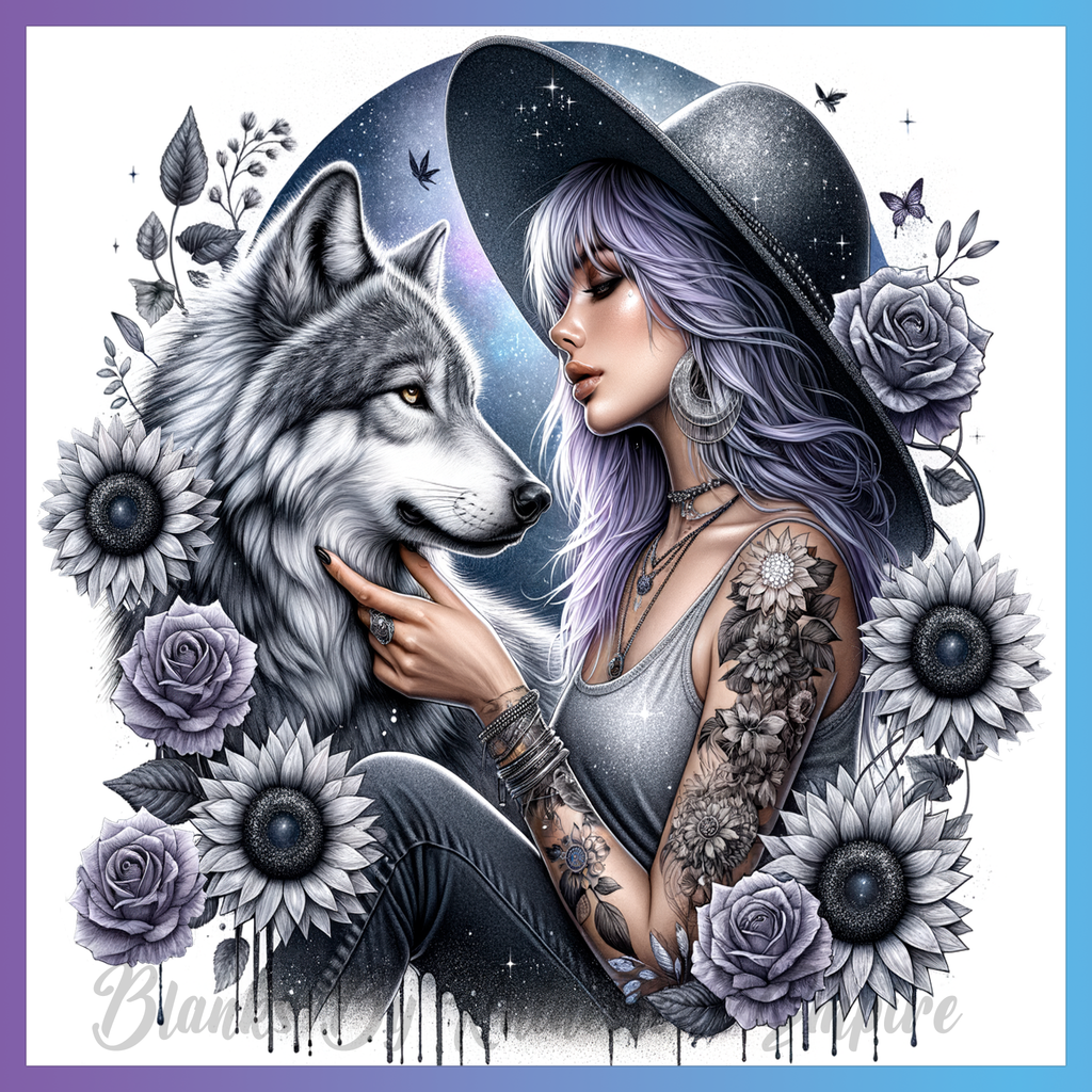 Theme: Girl with wolf, tattoo, hat, flowers.