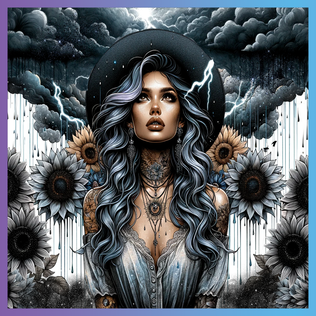 Theme: Girl with tattoo, sunflowers, storm, hat.