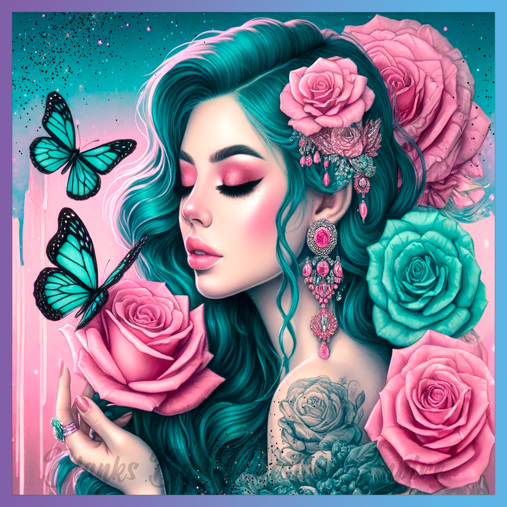 Theme: Girl with roses, butterflies, jewelry, makeup.