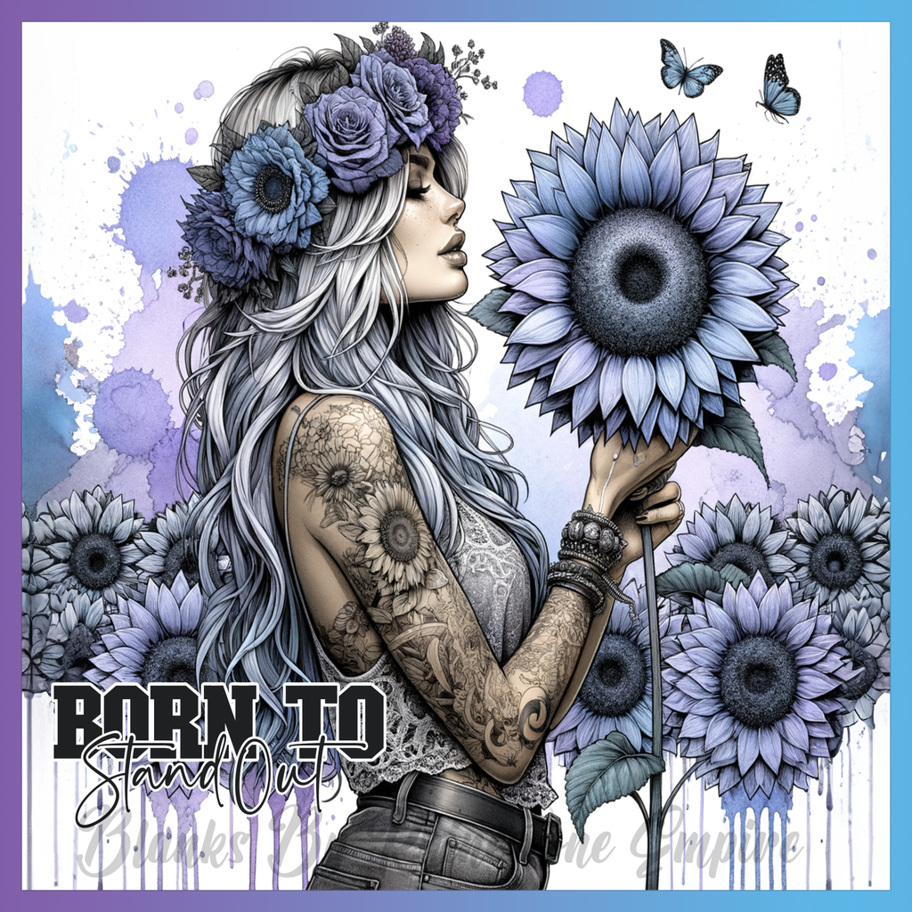 Theme: Girl with tattoo, flowers, sunflower, blue.
