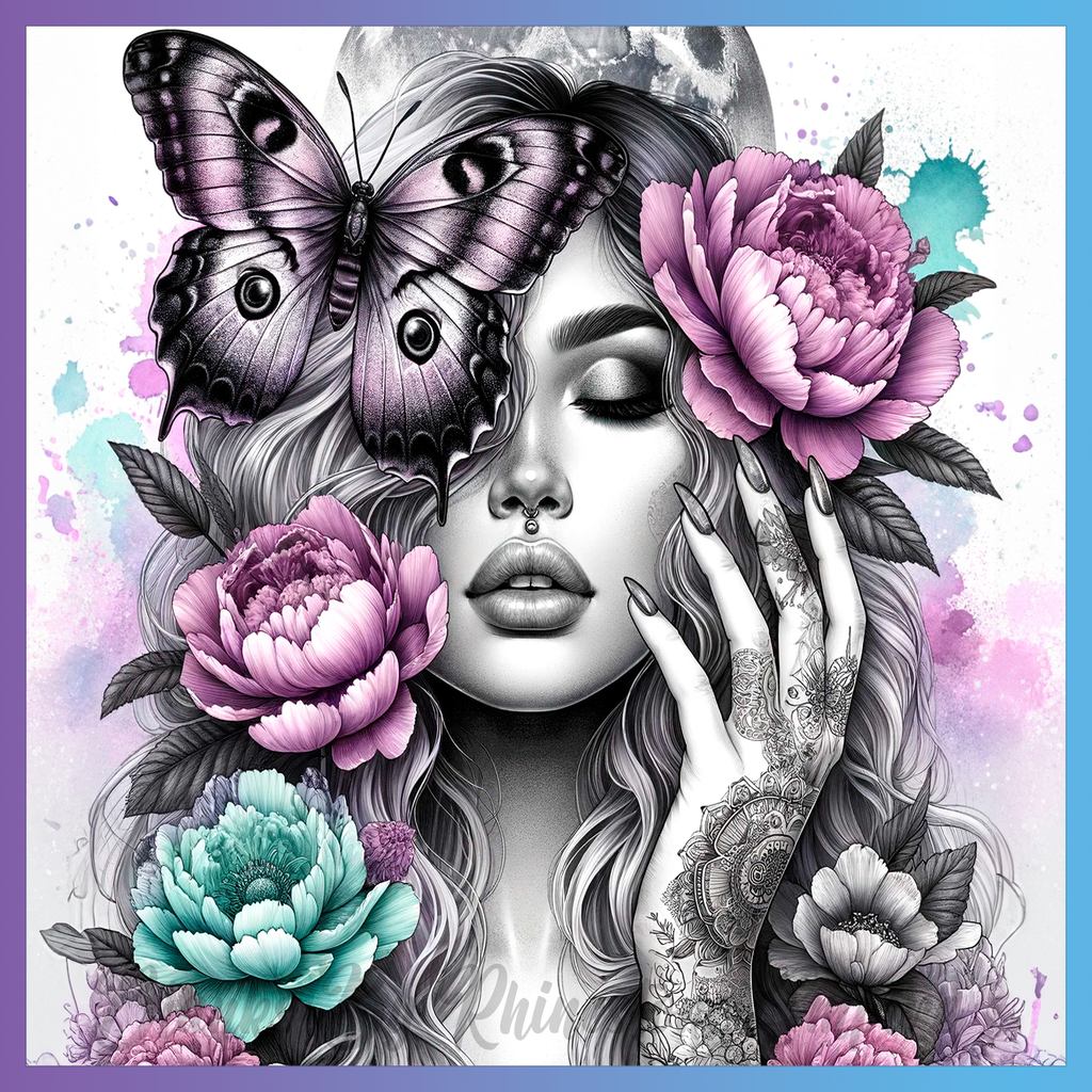 Theme: Girl with butterfly, flowers, tattoo, moon.