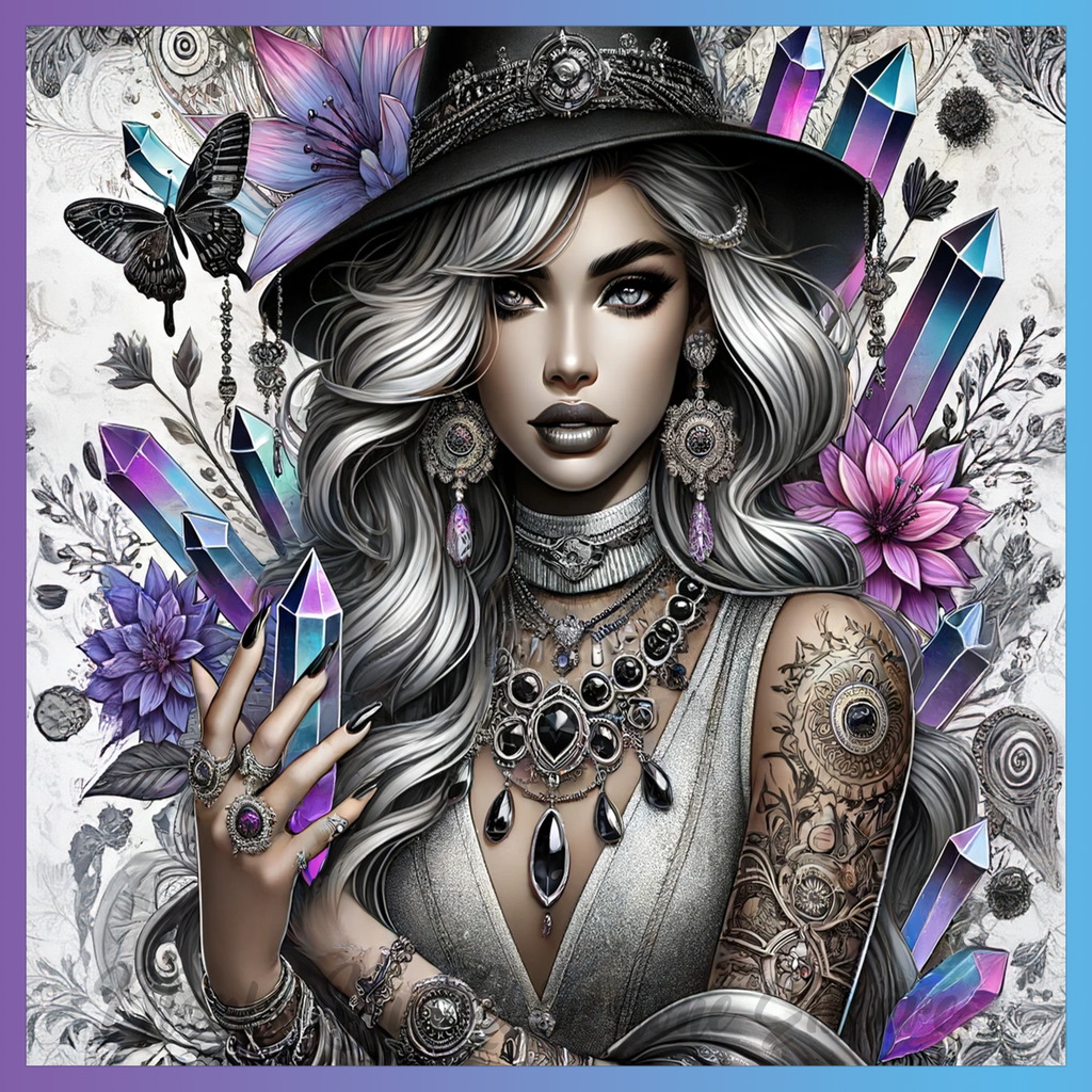 Theme: Girl with tattoo, crystals, flowers, hat.