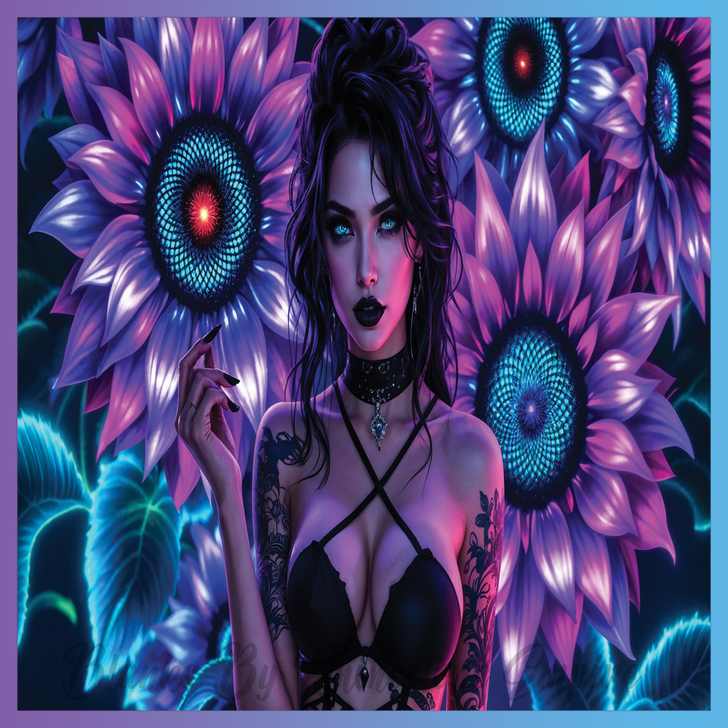 Theme: Girl with tattoo, flowers, dark, vibrant.