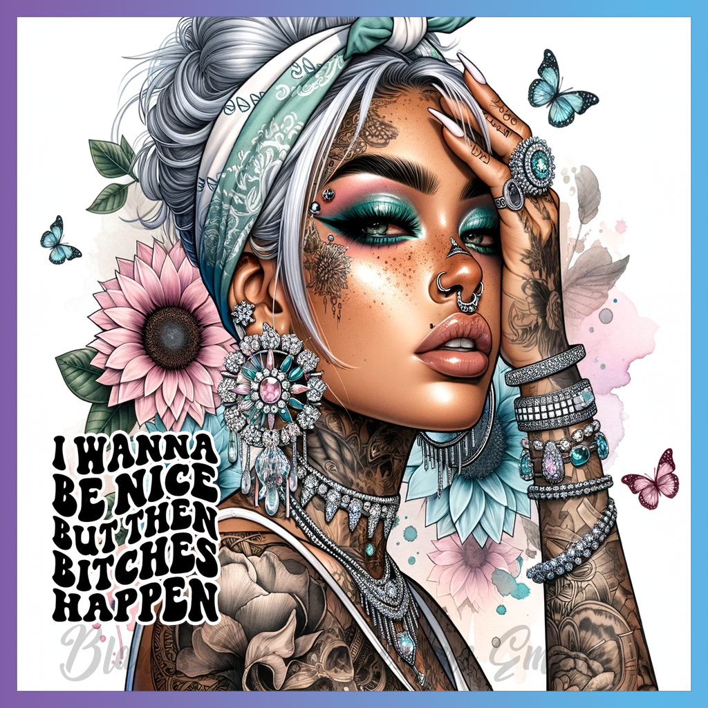 Theme: Girl with tattoo, flowers, butterflies, jewelry.