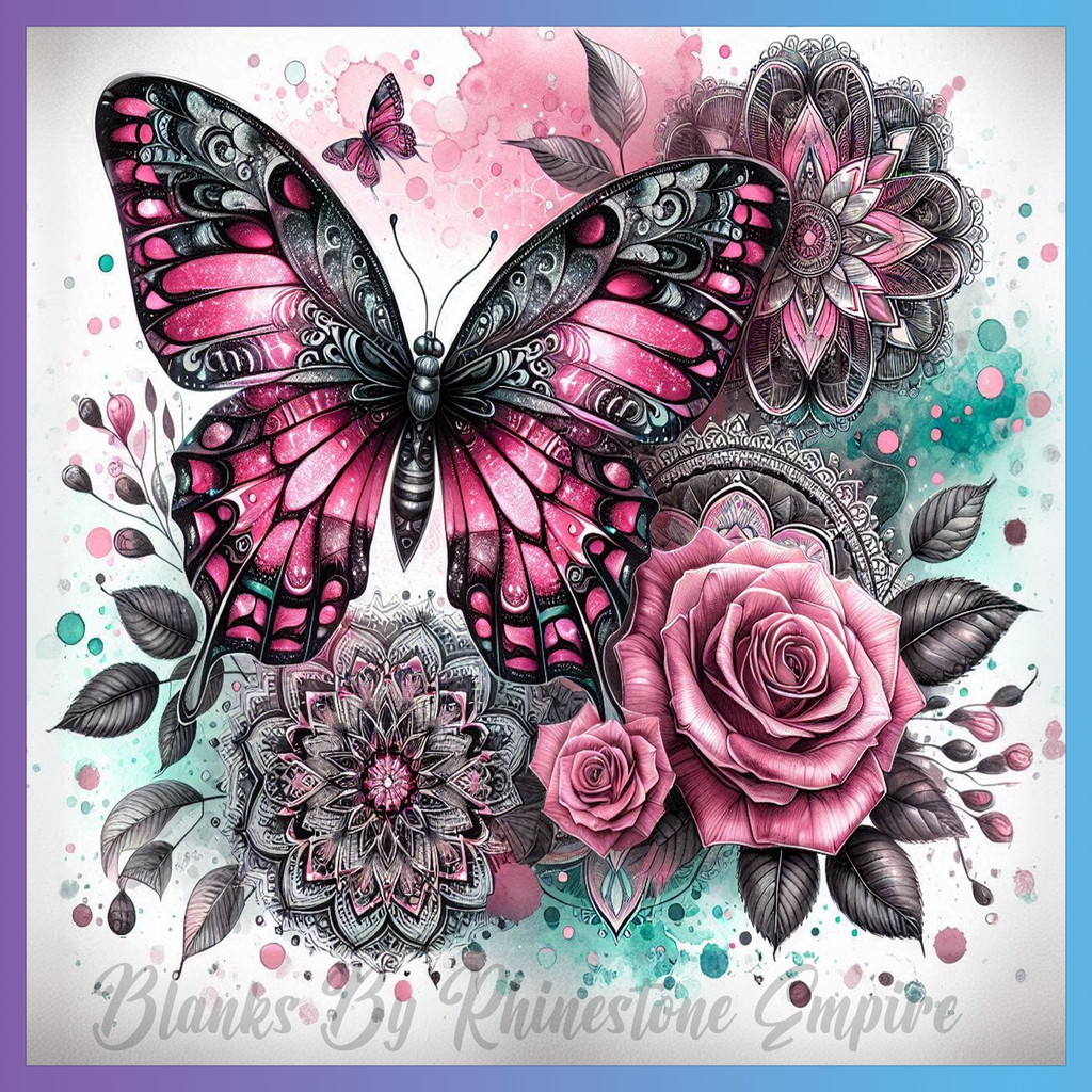 Theme: Butterfly with pink, flowers, mandala, watercolor.