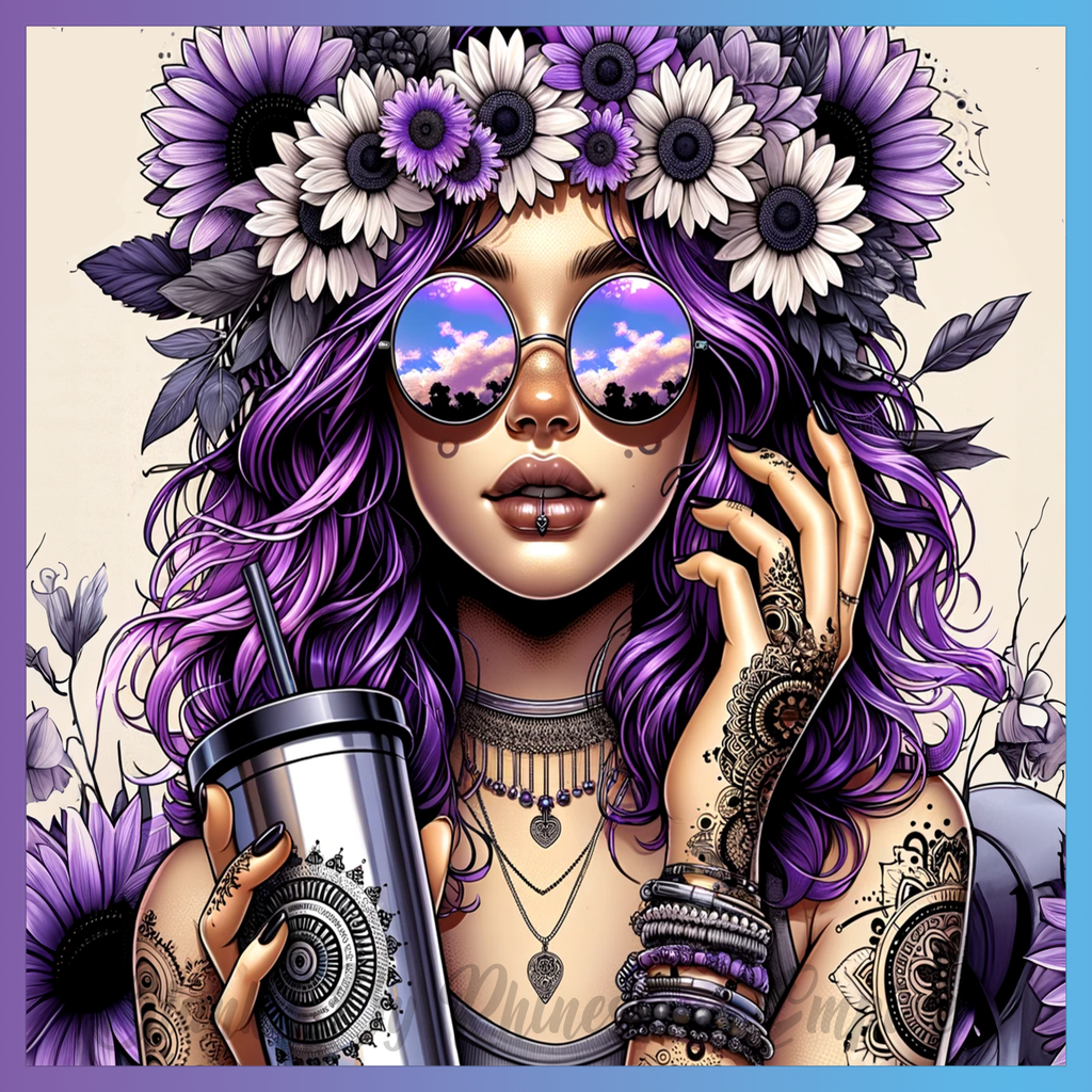 Theme: Girl with tattoo, flowers, sunglasses, purple hair.