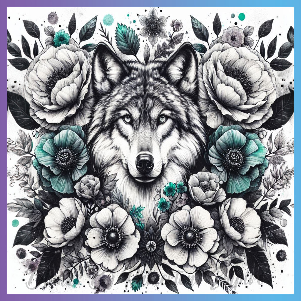 Theme: Wolf with flowers, black and white, illustration, nature.