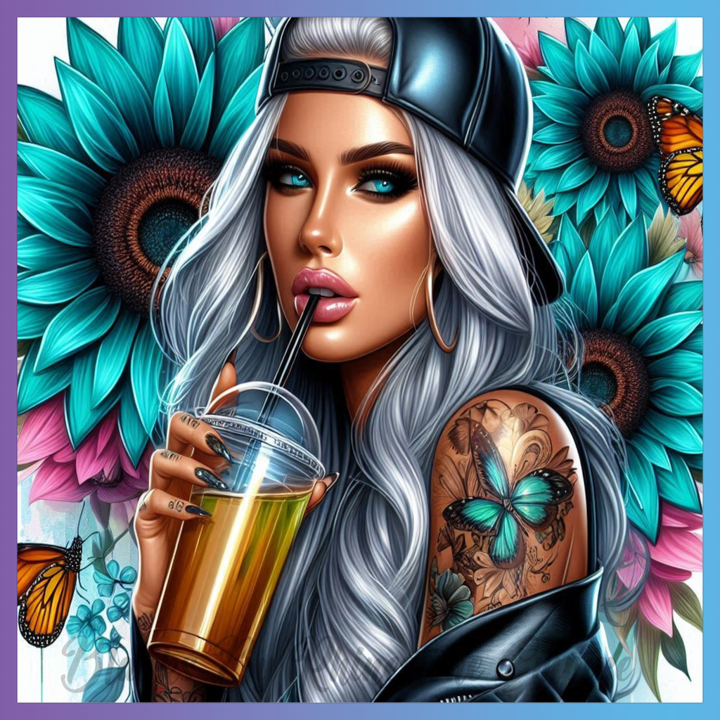 Theme: Girl with tattoo, flowers, butterflies, drink.