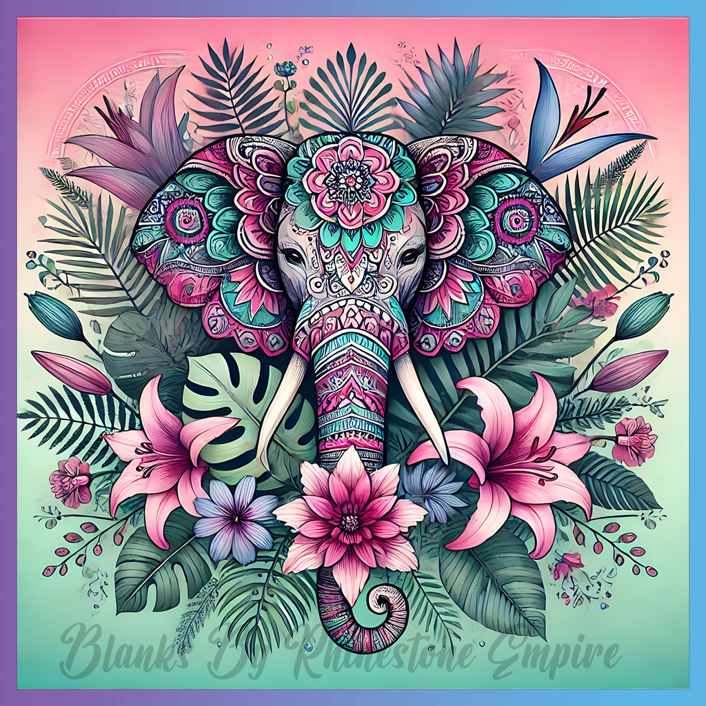 Theme: Elephant with mandala, flowers, leaves, tropical.