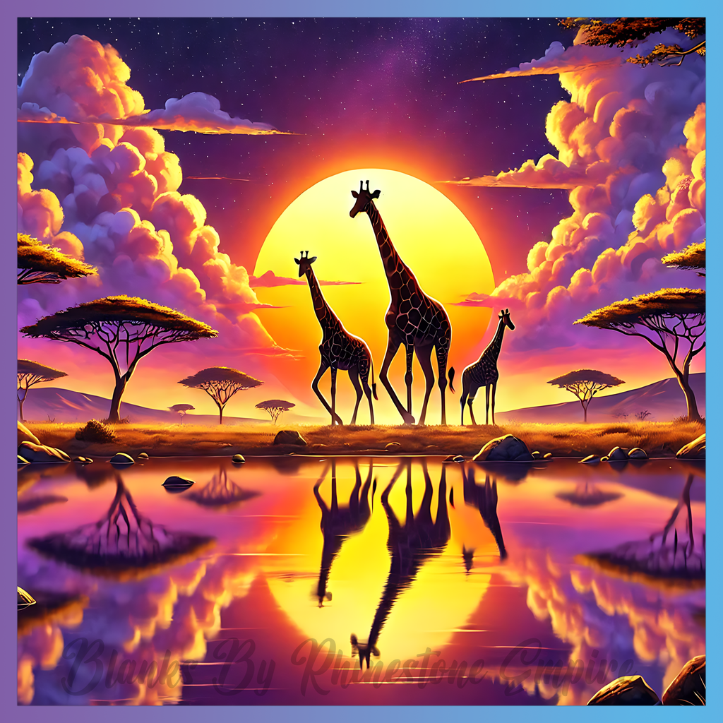 Theme: Giraffe with sunset, reflection, savanna, silhouette.