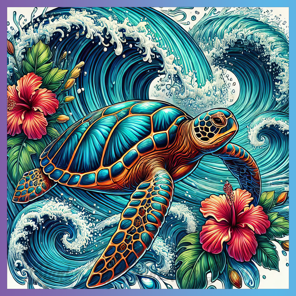 Theme: Turtle with waves, flowers, ocean, colorful.