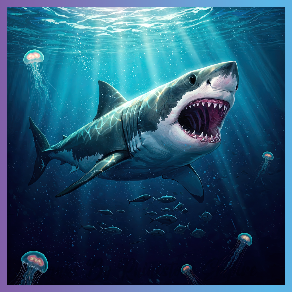 Theme: Shark with ocean, jellyfish, underwater, predator.