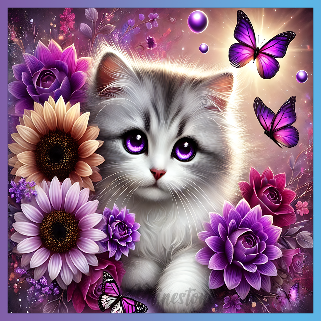 Theme: Cat with flowers, butterflies, purple, whimsical.