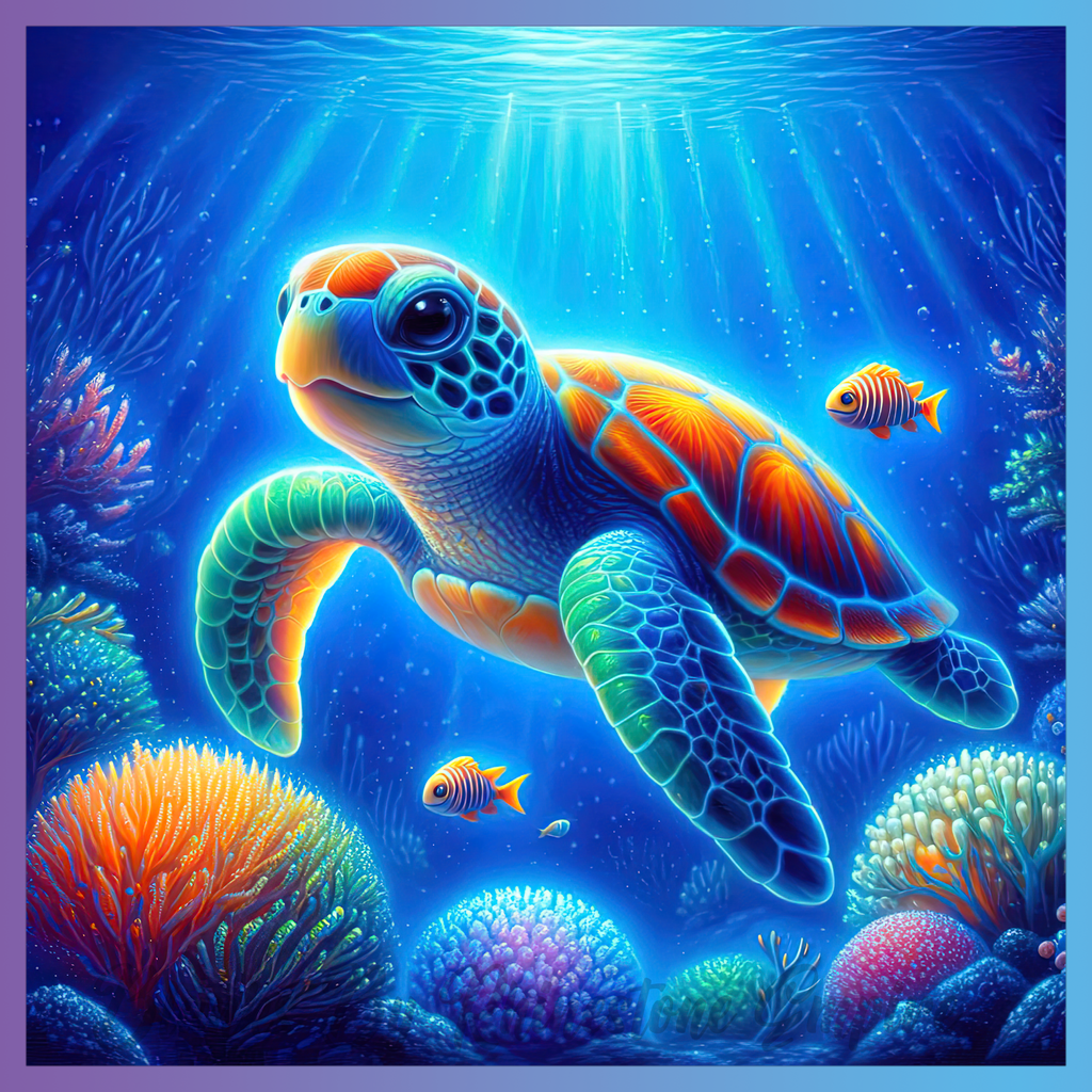 Theme: Turtle with coral, ocean, colorful, fish.